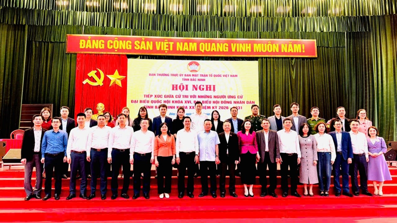 Chủ tịch Hiệp hội Thức ăn chăn nuôi Việt Nam Nguyễn Như So cùng các ứng viên đại biểu Quốc hội khóa XVI và HĐND tỉnh nhiệm kỳ 2026-2031 tại Hội nghị tiếp xúc cử tri phường Đông Ngàn ngày 3/3.