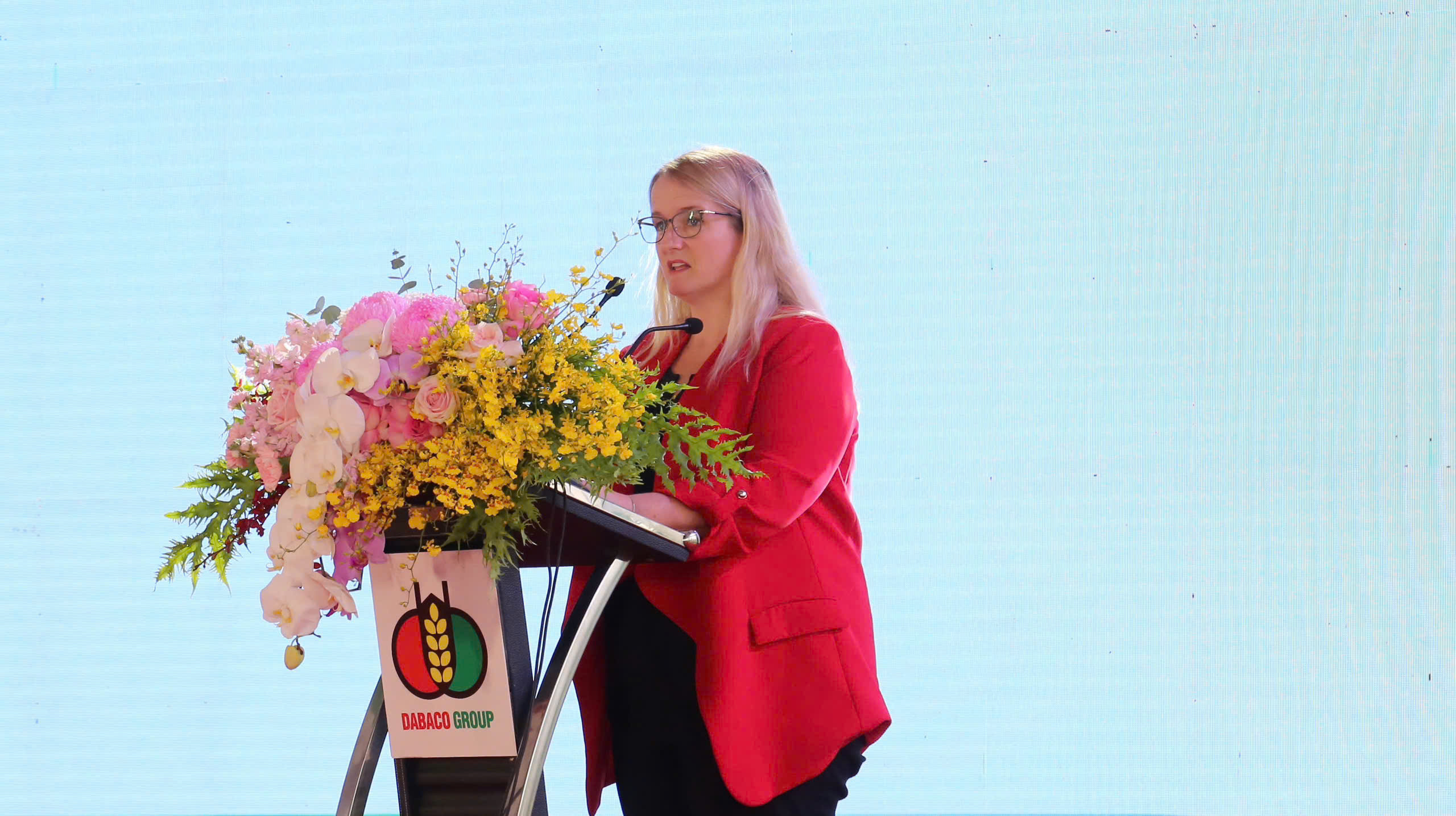 Trên phương diện hợp tác quốc tế, Bà Emilie Carrier – đại diện Đại sứ quán Canada khẳng định Dabaco chính là cầu nối thương mại vững chắc giữa hai quốc gia, góp phần quan trọng trong việc thúc đẩy giao thương nông sản và xây dựng chuỗi cung ứng thực phẩm an toàn toàn cầu.