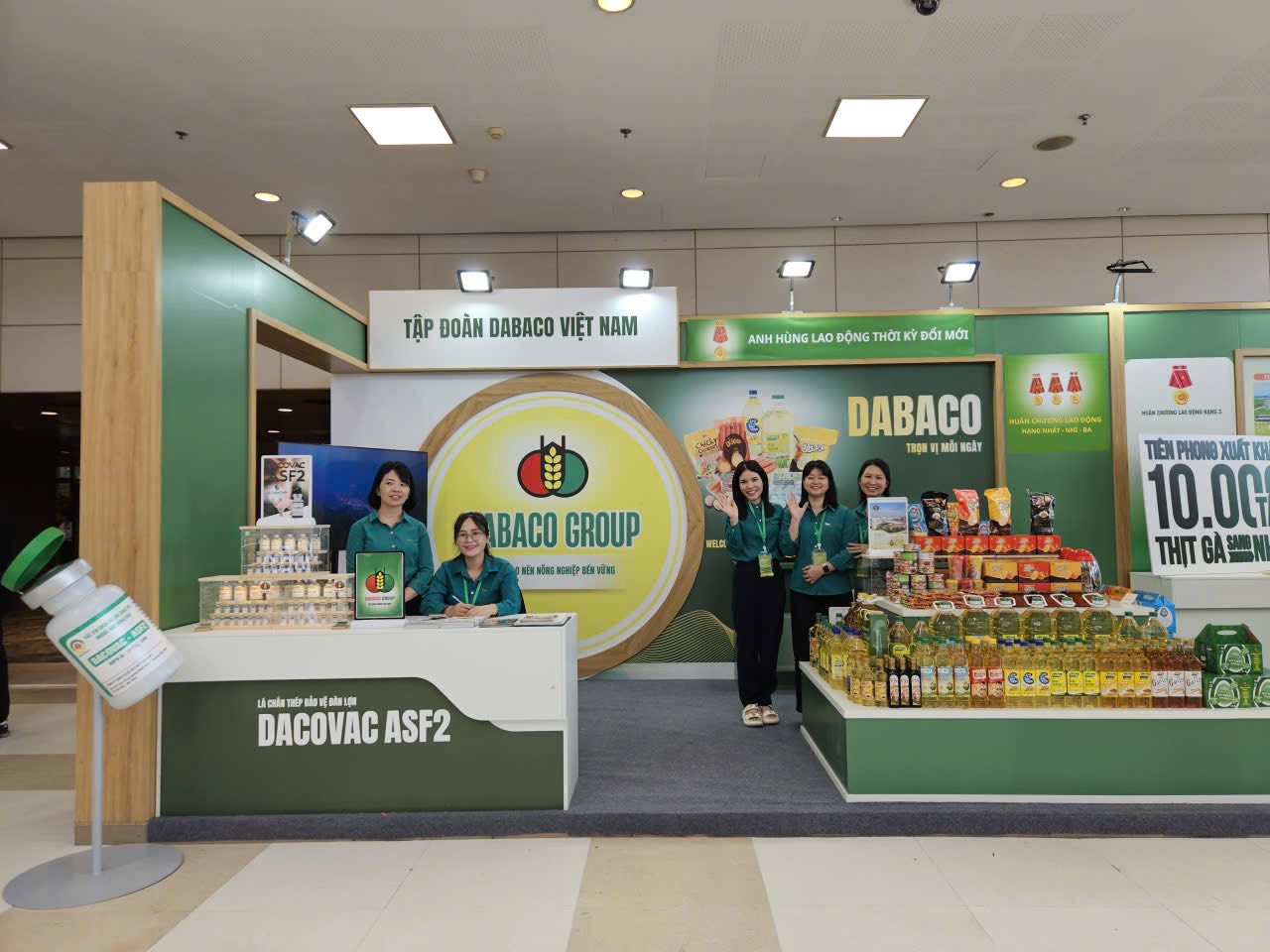 Gian hàng trưng bày của Dabaco được thiết kế sinh động, đa dạng sản phẩm, thể hiện rõ triết lý phát triển bền vững và tư duy đổi mới sáng tạo.