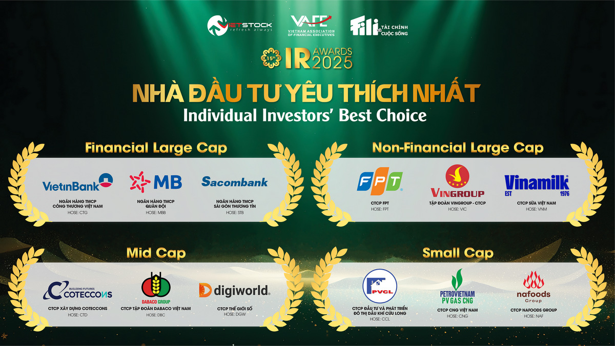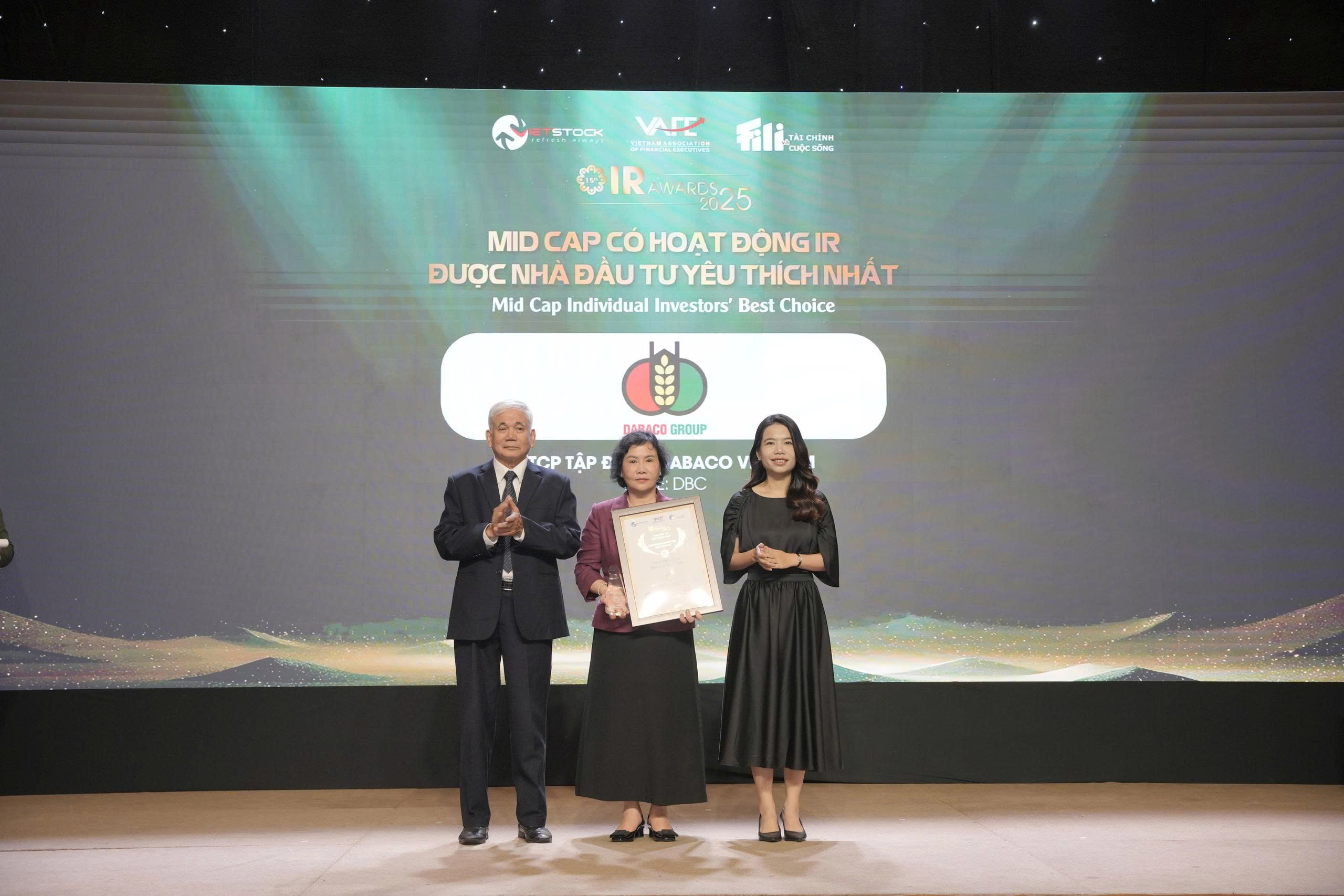 Ngày 2/10/2025, tại Lễ vinh danh IR Awards lần thứ 15, Tập đoàn Dabaco Việt Nam đã vinh dự được trao tặng danh hiệu “Mid Cap có hoạt động IR được Nhà đầu tư yêu thích nhất năm 2025” . Đây chính là ghi nhận những nỗ lực bền bỉ và chiến lược của Dabaco trong việc nâng tầm chuẩn mực quan hệ nhà đầu tư tại Việt Nam.